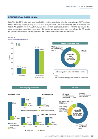 Pada Disember 2023, AUM Islam berjumlah RM226.14 bilion, peningkatan tahun-ke-tahun sebanyak 9.85% daripada RM205.86 bilion pada penghujung 2022 (Carta 4). Bilangan amaun CIS (UTF, dana borong, PRS, REIT and ETF) Islam kepada 415 pada Disember 2023, termasuk 28 dana SRI Islam. Selanjutnya, terdapat 59 syarikat pengurusan dana yang menguruskan dana Islam, merangkumi 24 syarikat pengurusan dana islam sepenuhnya dan 35 syarikat pengurusan dana konvensional dengan produk dan perkhidmatan Islam pada Disember 2023.