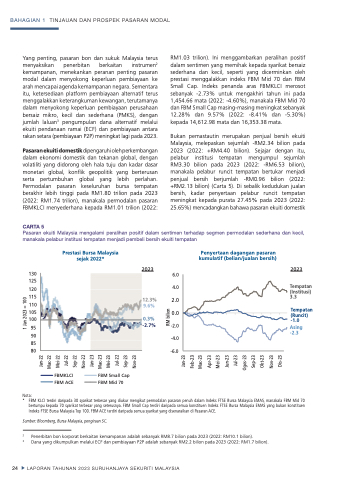 RM1.03 trilion). Ini menggambarkan peralihan positif dalam sentimen yang memihak kepada syarikat bersaiz sederhana dan kecil, seperti yang dicerminkan oleh prestasi menggalakkan indeks FBM Mid 70 dan FBM Small Cap. Indeks penanda aras FBMKLCI merosot sebanyak -2.73% untuk mengakhiri tahun ini pada 1,454.66 mata (2022: -4.60%), manakala FBM Mid 70 dan FBM Small Cap masing-masing meningkat sebanyak 12.28% dan 9.57% (2022: -8.41% dan -5.30%) kepada 14,612.98 mata dan 16,353.38 mata.