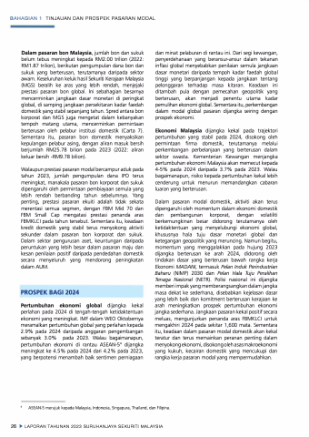 Dalam pasaran modal domestik, aktiviti akan terus dipengaruhi oleh momentum dalam ekonomi domestik dan pembangunan korporat, dengan volatiliti berkemungkinan besar didorong terutamanya oleh ketidaktentuan yang menyelubungi ekonomi global, khususnya hala tuju dasar monetari global dan ketegangan geopolitik yang meruncing. Namun begitu, momentum yang menggalakkan pada hujung 2023 dijangka berterusan ke arah 2024, didorong oleh tindakan dasar yang berterusan bawah rangka kerja Ekonomi MADAN/, termasuk Pelan lnduk Perindustrian Baharu (NIMP) 2030 dan Pelan Ha/a Tuju Peralihan Tenaga Nasional (NETR). Palisi nasional ini dijangka memberi impak yang memberangsangkan dalam jangka masa dekat ke sederhana, disebabkan kejelasan dasar yang lebih baik dan komitment berterusan kerajaan ke arah meningkatkan prospek pertumbuhan ekonomi jangka sederhana. Jangkaan pasaran kekal positif secara meluas, mengunjurkan penanda aras FBMKLCI untuk mengakhiri 2024 pada sekitar 1,600 mata. Sementara itu, keadaan dalam pasaran modal domestik akan kekal teratur dan terus memainkan peranan penting dalam menyokong ekonomi, disokong oleh asas makroekonomi yang kukuh, kecairan domestik yang mencukupi dan rangka kerja pasaran modal yang mempermudahkan.