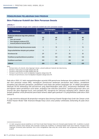 Pada tahun 2023, SC telah mempertimbangkan sejumlah 658 permohonan berkenaan skim pelaburan kolektif (CIS) dan skim persaraan swasta (PRS), merangkumi permohonan berkenaan penubuhan dana baharu, pendaftaran prospektus dan dokumen penzahiran, pendaftaran surat ikatan dan perkara sampingan lain. Ini adalah peningkatan sebanyak 50.9% berbanding 436 permohonan yang dipertimbangkan pada 2022, terutamanya disebabkan oleh peningkatan dalam pendaftaran surat ikatan, prospektus dan dokumen penzahiran. Syarikat pengurusan dana unit amanah dan dana dagangan bursa, serta penyedia PRS, mengemas kini dokumen sepanjang tahun, sebelum akhir tempoh peralihan untuk pematuhan peruntukan tertentu dalam garis panduan8 CIS yang berkaitan pada tahun 2023 (Jadual 9).