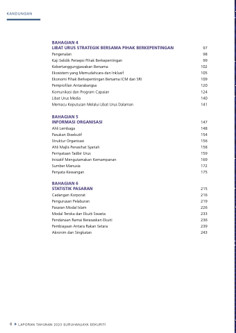 Pengenalan 98 Kaji Selidik Persepsi Pihak Berkepentingan 99 Kebertanggungjawaban Bersama 102 Ekosistem yang Memudahcara dan Inklusif 105 Ekonomi Pihak Berkepentingan Bersama ICM dan SRI 109 Pemprofilan Antarabangsa 120 Komunikasi dan Program Capaian 124 Libat Urus Media 140 Memacu Keputusan Melalui Libat Urus Dalaman 141