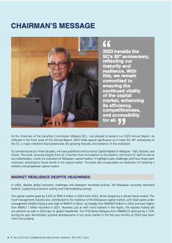 As the Chairman of the Securities Commission Malaysia (SC), I am pleased to present our 2023 Annual Report. As reflected in the front cover of this Annual Report, 2023 holds special significance as it marks the 30th anniversary of the SC, a major milestone that underscores the growing maturity and resilience of this institution.