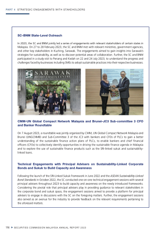 In 2023, the SC and BNM jointly led a series of engagements with relevant stakeholders of certain states in Malaysia. On 27 to 28 February 2023, the SC and BNM met with relevant ministries, government agencies, and other key stakeholders in Kuching, Sarawak. The engagements aimed to gain insights into Sarawak’s strategies for sustainability, as well as to discover potential areas of collaboration. Further, the SC and BNM participated in a study visit to Penang and Kedah on 22 and 24 July 2023, to understand the progress and challenges faced by businesses including SMEs to adopt sustainable practices into their respective businesses.