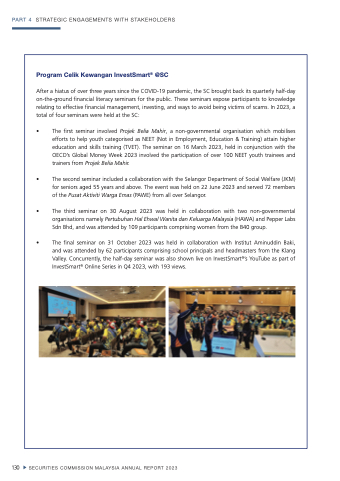 • The final seminar on 31 October 2023 was held in collaboration with Institut Aminuddin Baki, and was attended by 62 participants comprising school principals and headmasters from the Klang Valley. Concurrently, the half-day seminar was also shown live on InvestSmart®’s YouTube as part of InvestSmart® Online Series in Q4 2023, with 193 views.