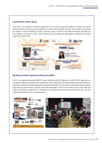 The SC once again participated in MFPC’s online ‘My Money & Me’ Programme. In 2023, MFPC organised on- the-ground physical workshops that covered four main components of financial planning: Asset Protection, Asset Accumulation, Asset Management and Asset Distribution at five locations nationwide namely Petaling Jaya, Penang, Kota Kinabalu, Kuantan and Kuala Terengganu. The SC was invited to give a talk under the Asset Accumulation component on ‘The Basics of Investing and How to Avoid Investment Scams’. The five workshops attracted over 1,195 participants.