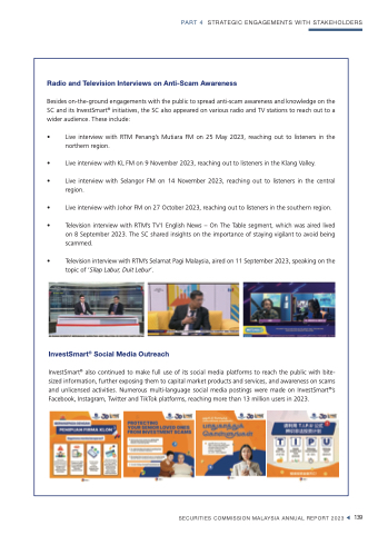 InvestSmart® also continued to make full use of its social media platforms to reach the public with bite- sized information, further exposing them to capital market products and services, and awareness on scams and unlicensed activities. Numerous multi-language social media postings were made on InvestSmart®’s Facebook, Instagram, Twitter and TikTok platforms, reaching more than 13 million users in 2023.