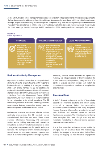 At the ERMC, the SC’s senior management deliberates key risks at an enterprise level and offers strategic guidance to the line departments for addressing these risks, which are also assessed in accordance with three critical impact areas: strategic, organisational resiliency as well as legal and compliance. Key risks are actively managed to minimise their impact on these critical areas. In 2023, a total of 23 meetings were held to deliberate various key issues. These include five ERMC meetings, four ORC meetings, six FRC meetings, four TCRC meetings and four meetings for SHC matters.