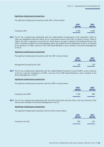 23.2 The SC has a related party relationship with the Capital Market Compensation Fund Corporation (CMC) as CMC was established under the CMSA, the SC may provide monies to the CMC as stated in Section 159(a) of CMSA, the CMC is required to consult the SC where there is an event of default of the Relevant Persons, the CMC is required to submit its annual regulatory report and audited financial statements to the SC as required by the provision of CMSA, and one of the CMC Board Members is also a member of the Senior Management in the SC.