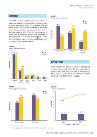 Since ECF was first established, the total number of issuers has reached 377. Nevertheless, the total number of issuers decreased to 50 in 2023, down from 66 in the previous year. While issuers continued to be mainly from Selangor and Kuala Lumpur, constituting 84% of the total issuers in 2023 (Chart 5), the proportion of issuers with a technology focus slightly decreased to 47%, compared to 57% in the preceding year. Chart 7 illustrates that the majority of issuers in 2023 have been in operation for more than 3 years.