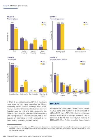 In Chart 4, a significant portion (47%) of investment notes issued in 2023 were categorised as Others2, comprising distinct product offerings from RMOs. However, investment notes issued for business and micro financing grew to 19% and 18% respectively. The majority of the investment notes were shorter term, with 54% having tenure of 3 months or less (Chart 5). The purpose of fundraising in 2023 continued to be predominantly for working capital (Chart 6).