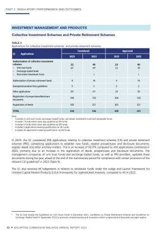 In 2023, the SC considered 658 applications relating to collective investment schemes (CIS) and private retirement schemes (PRS), comprising applications to establish new funds, register prospectuses and disclosure documents, register deeds and other ancillary matters. This is an increase of 50.9% compared to 436 applications considered in 2022, primarily due to an increase in the registration of deeds, prospectuses and disclosure documents. The management companies of unit trust funds and exchange-traded funds, as well as PRS providers, updated these documents during the year, ahead of the end of the transitionary period for compliance with certain provisions of the relevant CIS guidelines8 in 2023 (Table 9).
