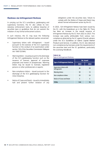 In 2023, 124 Infringement Notices have been issued by the SC, with the breakdown as in the Table 26. There has been an increase in the overall issuance of Infringement Notices by the SC from 2022 to 2023. This increase was partly attributable from various non- compliances detected by the SC against Shariah advisers under the SC’s Guidelines on Islamic Capital Market Products and Services. In addition, the SC also detected non-compliances by licensees under the requirements of the securities laws and the SC guidelines, particularly the Licensing Handbook.