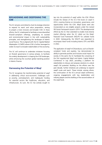 The application of waqf in ICM products, such as Shariah- compliant funds and equities, has demonstrated its ability to generate positive and inclusive social impact for society. In this spirit, the SC facilitated the convening of the first regulator-led Waqf and Islamic Capital Market Conference in July 2023, providing a platform for stakeholders to discuss and propose solutions to unlock waqf’s full potential. Building on the efforts over the past decade, further initiatives are underway to expand waqf’s scale and reach. These include, among others, the continuation of the SC’s annual waqf conference, ongoing engagements with key stakeholders and industry players and the drafting of the second edition of the waqf book.
