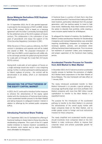 In 2023, the SC continued to introduce further measures to enhance the attractiveness of the equity capital market with the introduction of fractional share trading, a new accelerated transfer process to the Main Market and taking measures to safeguard investors’ interest in relation to offerings by the unlisted public companies (UPCs).