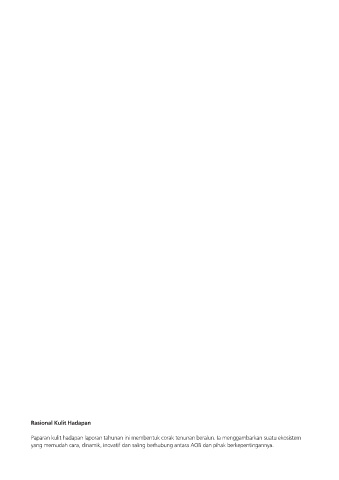 Rasional Kulit Hadapan Paparan kulit hadapan laporan tahunan ini membentuk corak tenunan beralun. Ia menggambarkan suatu ekosistem yang memudah cara, dinamik, inovatif dan saling berhubung antara AOB dan pihak berkepentingannya.