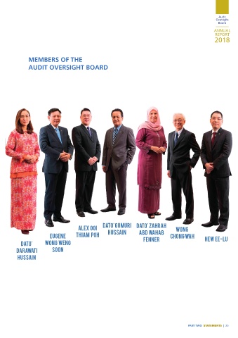 Audit Oversight Board ANNUAL REPORT 2018 MEMBERS OF THE AUDIT OVERSIGHT BOARD Alex Ooi Dato' Gumuri Dato' Zahrah Wong Eugene Thiam Poh Hussain Abd Wahab Chong Wah Hew Ee-Lu Fenner Dato' Wong Weng Darawati Soon Hussain PART TWO STATEMENTS | 25